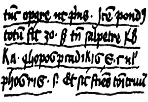 «Но получить из селитры LURU. VOPO VIR CAN VTRIET серы, и тогда ты сможешь создавать Гром и Молнию, если ты владеешь мастерством».Оригинальный текст (лат.)[показатьскрыть]Sed tamen sal petrae LURU VOPO VIR CAN VTRIET sulphuris; et sic facies tonitruum et coruscationem, si scias artificium.— Роджер Бэкон, «Послание монаха Роджера Бэкона о тайных действиях искусства и природы и ничтожестве магии»