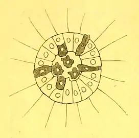 Предложенная Отто Бючли гипотеза плакулы представляет собой модифицированную версию гастреи Хеккеля, в которой урметазоя вместо полой сферы представляет собой двухслойный диск, очень похожий на анатомию плакозоа, который, загибаясь назад вокруг своей центральной точки, образует внутреннюю полость или архентерон.[2][14]