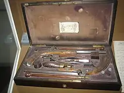 Дуэльные пистолеты времен Пушкина из музея А. С. Пушкина на Mойке, 12, Санкт-Петербург. Подлинный пистолет Пушкина не сохранился, пистолет Дантеса — в частном собрании во Франции