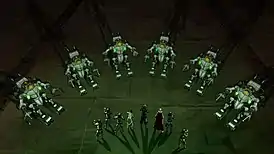![]() Хироши Сато и Уравнители в механических танках окружают Корру, Тензина, Лин Бейфонг и полицию | |||||