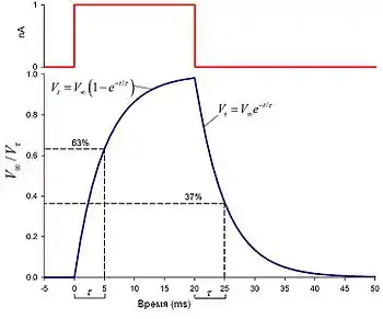 В этих уравнениях t — время, прошедшее после начала импульса (размерность — миллисекунды), — временная или мембранная постоянная (размерность — миллисекунды), V∞ (размерность — милливольт) — величина максимального значения мембранного потенциала, что может быть вычислено как:
