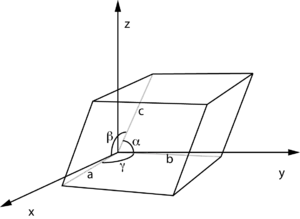 Принято считать что, параметры элементарной ячейки описываются 6 числами: 3 длинами рёбер и 3 углами между рёбрами, принадлежащими одной вершине параллелепипеда.