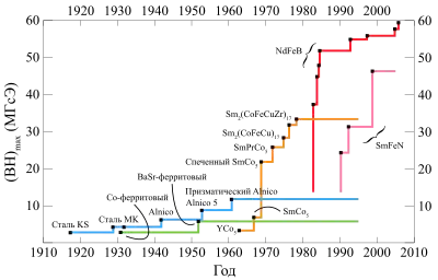 Следующий значительный технологический прорыв произошел в лаборатории U.S. Air Force Material Research, где было найдено интерметаллическое соединение самария с кобальтом (SmCo5) с большой константой магнитокристаллической анизотропии. Постоянный магнит, изготовленный из такого материала, позволил достигнуть свойств (ВН)макс = 16—24 мегаГаусс-Эрстедах (МГсЭ), а на соединении Sm2Co17 — 32 МГсЭ, коэрцитивная сила была повышена до 560—1000 кА/м. Магниты из SmCo производятся промышленностью с 1980-х годов. В это же время было обнаружено соединение Nd2Fe14B. Магниты из этого материала появились и в Японии, и в США одновременно в середине 1980-х годов, но технология их производства разнилась. В Японии производство организовывалось по типу магнитов SmCo: производство порошка из литого сплава, затем прессование в магнитном поле и спекание. В США был принят meltspinning process: сначала производится аморфный сплав, затем он измельчается, и изготавливается композиционный материал. Магнитный порошок связывается резиной, винилом, нейлоном или другими пластиками в композиционную массу, которую прессуют (инжектируют) или каландруют в изделия. Магниты из композиционного материала имеют по сравнению со спечёнными несколько более низкие свойства, однако не требуют гальванических покрытий, легко обрабатываются механически, зачастую имеют красивый внешний вид, будучи окрашенными в различные цвета. Магниты из Nd2Fe14B появились на рынке постоянных магнитов в 1990-х годах и очень быстро достигли на спечённых образцах энергии в 50 МгсЭ (400 кДж/м3). Этот материал быстро вытеснил другие, в первую очередь — в миниатюрной электронике.