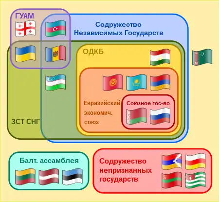Далее упоминаются международные организации, которые полностью или по большей части состоят из постсоветских государств.