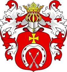 В красном поле опрокинутая подкова, увенчанная кавалерским крестом и сопровождаемая внутри двумя стрелами в андреевский крест.