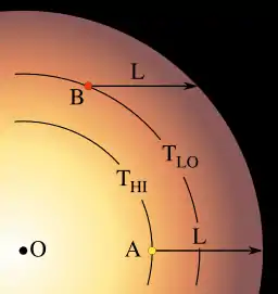 На представленном справа рисунке наблюдатель находится в точке P за пределами атмосферы звезды. Интенсивность излучения, наблюдаемая в направлении θ, является функцией угла ψ. Интенсивность можно представить в виде полинома по степеням cos ψ: