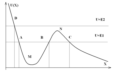 На приведённом изображении участок BNC является потенциальным барьером для частицы с энергией E1. Потенциальным барьером для частицы с энергией E2 служит участок от нуля до точки D, так как частица не в состоянии подойти к началу координат ближе, чем координата точки D.