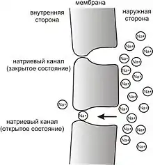 Благодаря работе «натрий-калиевого насоса» концентрация ионов натрия в цитоплазме клетки очень мала по сравнению с окружающей средой. При проведении потенциала действия открываются потенциал-зависимые натриевые каналы и положительно заряженные ионы натрия поступают в цитоплазму по градиенту концентрации, пока он не будет уравновешен положительным электрическим зарядом. Вслед за этим потенциал-зависимые каналы инактивируются и отрицательный потенциал покоя восстанавливается за счёт диффузии из клетки положительно заряженных ионов калия, концентрация которых в окружающей среде также значительно ниже внутриклеточной.