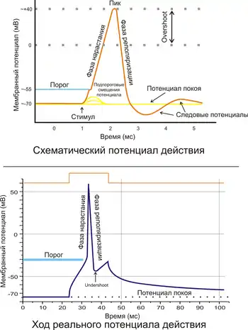 - Пиковый потенциал, или спайк, состоящий из восходящей части (деполяризация мембраны) и нисходящей части (реполяризация мембраны).