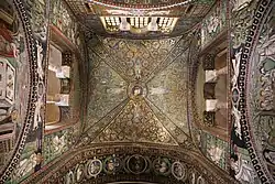 Потоло́к — нижняя часть ограждающей конструкции, ограничивающая помещение сверху. Потолок может быть непосредственно нижней частью перекрытия или покрытия, либо подвесным — образованным особыми конструктивными элементами.[1] Конструкция, совмещающая функции потолка помещения и крыши, носит название «покрытие здания».[2]. В теории архитектуры и в проектных чертежах — плафон — вид, проекция на архитектурное сооружение снизу (антоним понятия «план» — вид сверху). Отсюда второе, более известное значение слова — композиция, роспись, мозаика, лепнина, украшающие потолок интерьера здания. Центральная часть плафона без падуг и обрамления называется зеркалом.
