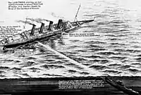 | Немецкая иллюстрация атаки «Лузитании» | Пробоина в корпусе «Лузитании» после попадания торпеды | Тонущая «Лузитания» и субмарина U-20 | Иллюстрация тонущей «Лузитании» в выпуске газеты «London News» от 15 мая 1915 |
