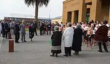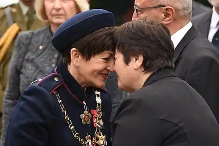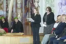 Гости рассаживаются самостоятельно, обычно — все рядом[30]. Обычно первый ряд занимают ораторы-мужчины, однако после произнесения речей некоторые места в первом ряду могут занять высокопоставленные женщины[31].