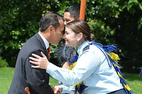 После установления духовной связи между гостями и хозяевами они обмениваются хонги, что устанавливает физическую связь[34]. Обычно сначала оратор совершает хонги с мужчинами, а затем с женщинами[35]. При совершении хонги гости и хозяева выстраиваются в параллельные линии и двигаются навстречу[36]. При этом считается достаточным, если хонги совершат только высокопоставленные гости[36].