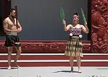 Слова каранги выбирает исполнительница, обычно они повествуют об уважении к умершим предкам гостей и хозяев, а также о цели визита[25]. После этого обе стороны входят на мараэ[2]. Каранга может сообщить, что от гостей ожидается, чтобы они сразу вошли в общинный дом[26].