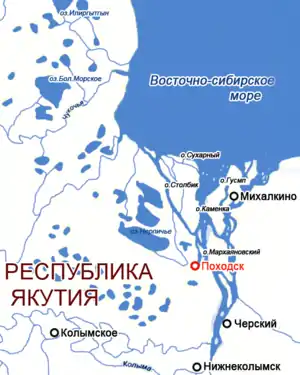 Русские переселенцы появились в низовьях реки Колымы в XVII веке, Иван Ерастов и Дмитрий Михайлов (Зырян Ярило) прошли с Индигирки на Алазею морем, а в 1641 году Михаил Стадухин достиг морем Колымы[10]. В 1643 году Стадухин уже поставил зимовье на Колыме — Среднеколымский острог и не позднее лета 1647 года Нижнеколымский[11], рядом с ним основывают село Походск.