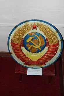 - Памятная металлическая плита, на которой был выгравирован Государственный герб СССР