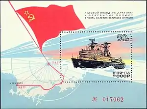 ![]() Почтовый блок, выпущенный в СССР в 1977 году, посвящённый походу | |