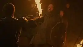 ![]() На испытании поединком Пса с Бериком Дондаррионом, видна его боязнь огня. | |||||