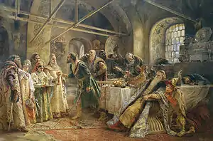 Хозяйка в жёлтом летнике держит в руке кубок. Гость в тафье и зелёном кафтане с воротником-козырем.