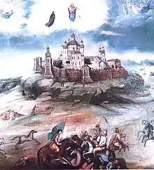 2 августа 1675 года пятидесятитысячное турецко-татарское войско под руководством хана Нурредина подступило к Почаеву. Жители соседних поселений сбежались к монастырю, который был обнесён в ту пору только грубым деревянным частоколом. Все, кто только в силе был держать оружие, как из числа монахов, так и из числа мирян, стали на защиту обители. По преданию, во время чтения акафиста перед Почаевской иконой Божьей Матери на небе вдруг расступились тучи, и над собором появилась сама Богородица в блестящем сиянии, окружённая ангелами, а рядом с ней молящийся Иов Почаевский. Татары приняли небесное воинство за привидение, в смятении стали стрелять в Богородицу и преподобного Иова, но стрелы возвращались назад и ранили тех, кто их пускал. В паническом бегстве, не разбирая своих, они убивали друг друга. Защитники монастыря устремились в погоню и захватили многих в плен. Некоторые пленные впоследствии приняли христианскую веру и остались в обители навсегда.