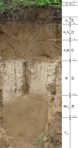 Для горизонтов принято буквенное обозначение, позволяющее записывать строение профиля. Например, для дерново-подзолистой почвы: A0-A0A1-A1-A1A2-A2-A2B-BC-C[10].