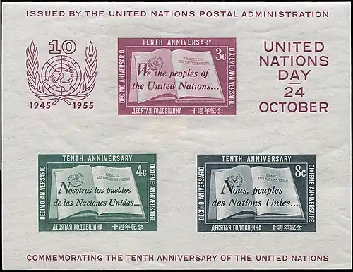 Почтовая администрация ООН выпустила первые марки для нью-йоркского офиса в 1951 году, приурочив их к Международному дню ООН (24 октября 1951 года). Первые выпуски вызвали огромный интерес со стороны коллекционеров, многие ранние коммеморативные марки были проданы миллионными тиражами. Самым редко встречающимся филателистическим материалом этого периода, хотя, всё же, довольно доступным, является почтовый блок к 10-летию ООН (Sc #38), напечатанный тиражом 250 тыс. экземпляров с ошибкой (небольшое белое поле в правой ножке буквы «n» в слове «Unies») и позже исправленный и допечатанный вторым тиражом. В настоящее время рыночная стоимость блока даже второго тиража — $200—240.