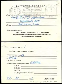 Лицевая и оборотная стороны почтовой карточки Всесоюзной государственной библиотеки иностранной литературы с франкотипом (СССР, 1986)