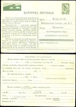 Лицевая и оборотная стороны маркированной почтовой карточки заказа железнодорожных билетов (СССР, 1966) со стандартной маркой (1961, 3 копейки)