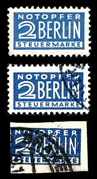 После организации союзниками воздушного моста, прорвавшего блокаду Западного Берлина, экономический совет зоны англо-американской оккупации (Wirtschaftsrat des Vereinigten Wirtschaftsgebietes) принял 8 ноября 1948 года закон, называвшийся «Gesetz zur Erhebung einer Abgabe Notopfer Berlin im vereinigten Wirtschaftsgebiet» («О взимании налога на нужды Берлина в объединённой экономической зоне»)[2]. В соответствии с этим законом на бо́льшую часть внутригерманских почтовых отправлений (кроме отправлений в Западный Берлин и ГДР) дополнительно к стандартному почтовому сбору наклеивалась специальная налоговая марка принудительной доплаты номиналом в 2 пфеннига (при стоимости простого письма 20 пфеннигов). Доход от продажи марок направлялся в пользу нуждающихся жителей Западного Берлина. Закон действовал до 31 марта 1956 года. Без этих марок письма не доставлялись, а возвращались отправителю, если был указан обратный адрес. Если обратного адреса на конверте не было, то спустя определённое время такие письма вскрывались на предмет установления из содержания письма адреса отправителя и в случае его отсутствия уничтожались в официальном порядке.