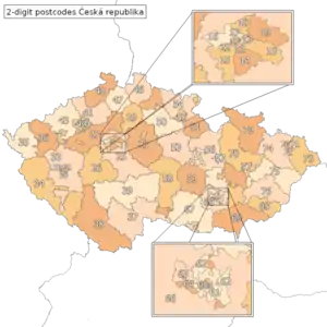 - 1 — столица Чешской Республики, Прага. Вторая цифра обозначает один из 10 районов Праги; так, к примеру, 160 00 обозначает почтамт в Праге (6 — Дейвице).