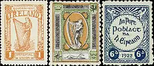 Особняком стоят две надпечатки, отражающие изменение в названии ирландского государства в декабре 1922 года. В частности, надпечатка ирл. «Rialtas Sealadach na hÉireann» («Временное правительство Ирландии») были первоначально сделаны 17 февраля 1922 года. При этом восемь марок с надпечатками низких номиналов и три — высоких были надпечатаны фирмой «Dollard», а четыре — фирмой «Thom»[15]. Данная надпечатка состоит из четырёх слов: «Rialtas Sealadach na hÉireann» и цифрового обозначения года: «1922», расположенных в четыре строки и напечатанных шрифтом с засечками (дополнительными графическими элементами)[16]. Почтовыми марками без надпечатки разрешалось франкировать корреспонденцию в Ирландии до 31 марта 1922 года[17].