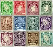 Первые двенадцать стандартных марок — низких номиналов до 1 шиллинга — появились в 1922—1923 годах, а три высоких номинала, 2 шиллинга 6 пенсов, 5 и 10 шиллингов, вышли лишь 8 сентября 1937 года. Рисунки этих марок — «Меч света», «Карта Ирландии», «Кельтский крест», «Гербы Четырёх провинций» и «Святой Патрик»[20]. В последующие годы эти марки выходили с водяным знаком и дополнительными номиналами, пока в 1968 году не появились новые рисунки по мотивам раннего ирландского искусства. Последние известны как «стандартные марки Герла» (Gerl definitives) — по имени немецкого дизайнера Генриха Герла (нем. Heinrich Gerl), создавшего эту серию марок. Это были первые новые рисунки за 31 год для высоких номиналов и за 46 лет для низких номиналов. Номиналы трёх серий «Герл» были указаны в фунтах стерлингов, в десятичной валюте (оба выпуска были с водяными знаками) и наконец без водяных знаков[21].