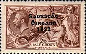 Надпечатки «Saorstát Éireann» («Ирландское Свободное государство») появились 11 декабря 1922 года. Они сделаны в три строки с использованием типографского шрифта sans-serif. Их производили компании «Thom», «Harrison» и государственная типография. Последними марками с надпечаткой стали перегравированные компанией «Waterlow and Sons»[18] марки с королём Георгом V номиналами в 2 шиллинга 6 пенсов, 5 и 10 шиллингов, которые были изданы в 1934 году и надпечатаны в 1937 году для использования в Ирландии[19].