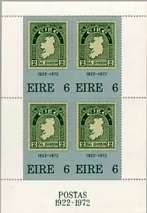 Первый малый лист в виде четырёх почтовых марок в формате «марка на марке» (то есть с изображением марок) появился в 1972 году по случаю 50-летия первой марки Ирландии и независимости страны[27].