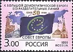 50-летие образования Совета Европы. Флаг Совета Европы с изображенным на нем юбилейным знаком на фоне контурной карты евразийского материка, текст: «К большой демократической Европе без разделительных линий». Дворец Европы в Страсбурге (Франция), Спасская башня Московского Кремля. | 3.00 руб. |
