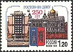 250 лет Ростову-на-Дону. Герб города Ростова-на-Дону (1811), здание речного вокзала (1977), здание городской Думы (1899), Кафедральный собор Рождества Пресвятой Богородицы (1854—1860). | 1.20 руб. |
