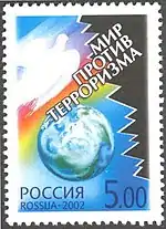 Мир против терроризма. Земной шар в голубом пространстве, радуга и белый голубь, символизирующие силы мира, силы зла воплощены в черном цвете. | 5 руб. |