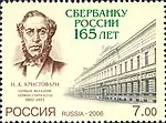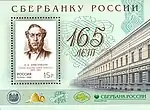 165 лет Сбербанку России. Вкладчик первой сберкассы Н. А. Кристофари и здание первой сберегательной кассы в Санкт-Петербурге. | 7.00 руб. |