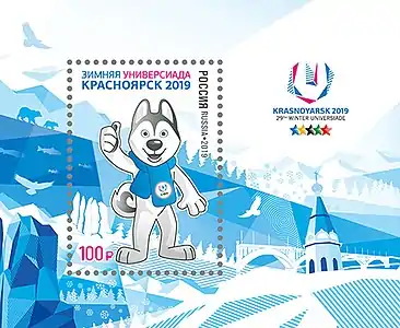 XXIX Всемирная зимняя универсиада 2019 года в г. Красноярске. Талисман Зимней универсиады 2019 — U-Лайка на фоне фирменного стиля Студенческих игр, а также логотип Универсиады-2019. | 100 руб. |