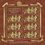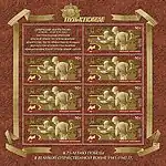 Международный год Периодической таблицы химических элементов (надпечатка на блоке 2009 г. «175 лет со дня рождения Д. И. Менделеева»). Портрет Д. И. Менделеева, периодическая система химических элементов Д. И. Менделеева, эталонные весы фирмы «Неметц» (1895) и друза горного хрусталя из коллекции минералов Д. И. Менделеева. Надпечатка на полях: «2019 год — Международный год Периодической таблицы химических элементов». | 80 руб. |