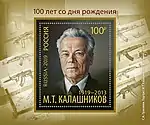 - № 2542 Блок. 100 лет со дня рождения М. Т. Калашникова (1919—2013), конструктора стрелкового оружия. АО «Марка». Дата обращения: 5 февраля 2020.