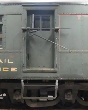 Интересной принадлежностью большинства почтовых вагонов был крюк, применявшийся для подхватывания кожаных или брезентовых сумок с исходящей почтой, висевших на прирельсовых почтовых кранах в небольших городках, которые поезд проходил без остановки. Первый американский патент на такое устройство (патент США № 61584) получил Л. Ф. Вард (L.F. Ward) из Элирии (Elyria), штат Огайо, 29 января 1867 года[32]. Поскольку скорость поезда порой достигала 70 миль в час и выше, почтовый служащий готовил почтовую сумку к передаче во время прохождения поездом станции. Скоординированным движением ловитель высовывался, чтобы подхватить висящую почтовую сумку, в то время как служащий стоял в дверях. Как только сумка с входящей почтой захватывалась, служащий сталкивал ногой сумку с исходящей почтой из вагона, стараясь вытолкнуть её подальше, чтобы её не увлекло потоком воздуха под набирающий скорость состав. Сотрудник местной почты поднимал сумку и доставлял её в почтовое отделение.