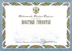 - Грамота Правительства Российской Федерации (недоступная ссылка)