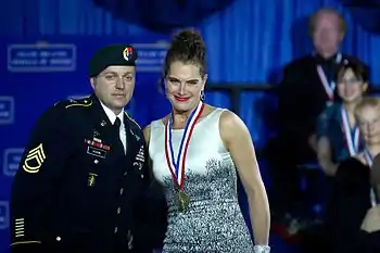 | Церемония вручения Почётной медали острова Эллис (12 мая 2012) | Начальник штаба сухопутных войск США, генерал Рэймонд Т. Одиерно после вручения медали (2012) | Актриса Брук Шилдс получает медаль от военнослужащего Специальных Сил Армии США (2012) |