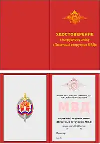 В пункте 15 приложения № 2 к приказу МВД России от 20 апреля 2017 года № 220 отмечается, что ведомственные знаки отличия, к коим относится знак «Почётный сотрудник МВД», а также удостоверения к ним, как правило, «вручаются награжденным в торжественной обстановке перед строем или на совещании (собрании)»[14]. Образец удостоверения к знаку утверждён приложением № 3 к Положению о знаке[15].
