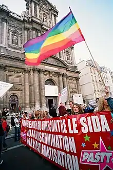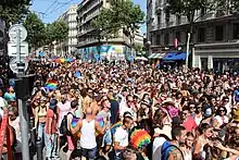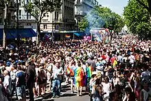 Первый парад гордости во Франции состоялся в Париже 4 апреля 1981 года на площади Мобер. Он был организован CUARH, и в нем приняли участие около 10 000 человек. Парижский прайд (фр. Marche des Fiertés de Paris) проводится ежегодно в июне. С 1980-х годов число участников значительно возросло, достигнув в конце 1990-х годов около 100 000 человек. В 2019 году в нем приняли участие 500 000 человек[79]. Это мероприятие является третьим по величине в городе, после Парижского марафона и Парижского технопарада, и включает в себя около 60 ассоциаций, различные правозащитные группы, политические партии и несколько компаний.
