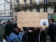 В июне 2011 года опрос французского института общественного мнения показал, что 63% респондентов выступают за однополые браки, а 58% поддерживают права на усыновление для однополых пар[3]. В 2012 году опрос французского института общественного мнения показал, что 90% французов воспринимают гомосексуальность как один из способов реализации своей сексуальности[83].