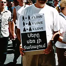 В 2011 году Армения подписала «совместное заявление о прекращении актов насилия и связанных с ними нарушений прав человека на основе сексуальной ориентации и гендерной идентичности» в Организации Объединённых Наций, осуждая насилие и дискриминацию в отношении ЛГБТ-людей.[2].