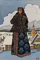 Главным традиционным костюмом для женщин выступали широкие и свободные сарафаны с широкими рукавами, которые почти или полностью покрывали тело женщины кроме головы и кистей рук. В зависимости от социального статуса женщины, сарафаны могли обильно украшаться орнаментами, вышивкой и прочими украшениями. Расцветка сарафанов могла различаться в разных губерниях России, в частности, на севере преобладали синий и чёрный цвета, на юге — красные[7]. Во времена, когда практиковалось затворничество женщины, она могла выходить за пределы дома для похода в церковь или посещения гостей с мужем во время празднеств. Как правило, домохозяйка состоятельного мужа не упускала возможность блеснуть роскошными нарядами. Церковь не противилась этому и даже поощряла, отмечая необходимость при походе в церковь «блюсти чистоту души, тела и красоту платья»[7]. Наряднее одеваться в церковь стремились и женщины из бедных семей, которым выходное платье нередко доставалось по наследству[7].