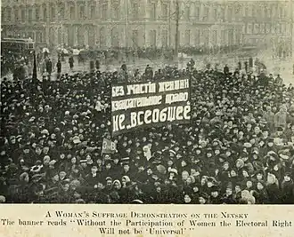 На фоне буржуазно-демократической революции и свержения существующей власти женские активистки начинают более усердную борьбу за свои права[33]. 19 марта 1917 года перед резиденцией Временного правительства в Петербурге состоялся 40-тысячный митинг, на который пришли в основном женщины, на демонстрации женщины требовали своего участия во всеобщем избирательном праве. Демонстрация закончилась, когда председатель Совета министров Временного правительства Г. Е. Львов заверил, что в избирательном праве будут участвовать мужчины и женщины[33]. Позже на выборах в Учредительное собрание появилась запись о всеобщем избирательном праве «без различия пола»[33]. После победы в выборах большевиков все иные организации, в том числе и женские, были объявлены вне закона. Таким образом, эпохе женского гражданского движения был положен конец[36].